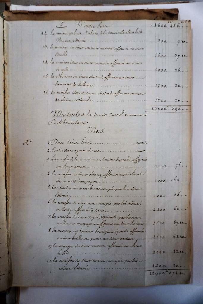 The second cadastre, which appears to be a copy of the original (or a copy of another copy), captures homeowner data for residents in Cap Français on November 11, 1787. The creation for the cadastre arose in response to an ordonnance passed on December 30, 1786, which required town residents to affix their house/residence number to the exterior of their dwelling. The resulting 39-page document captures the names of propriétaires along with the location and size of each residence, but nothing more. In all likelihood, this cadastre, as well as that of 1776, was acquired during the sale of the library of Monsier Bleschamps, ancien commissaire de la marine. Both documents were then copied and filed at the Dépôt des Papiers Publics des Colonies in 1826.